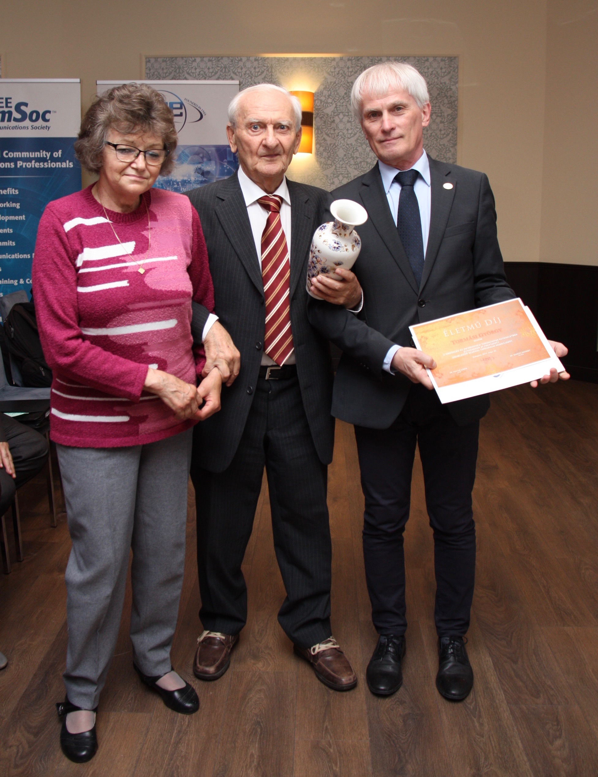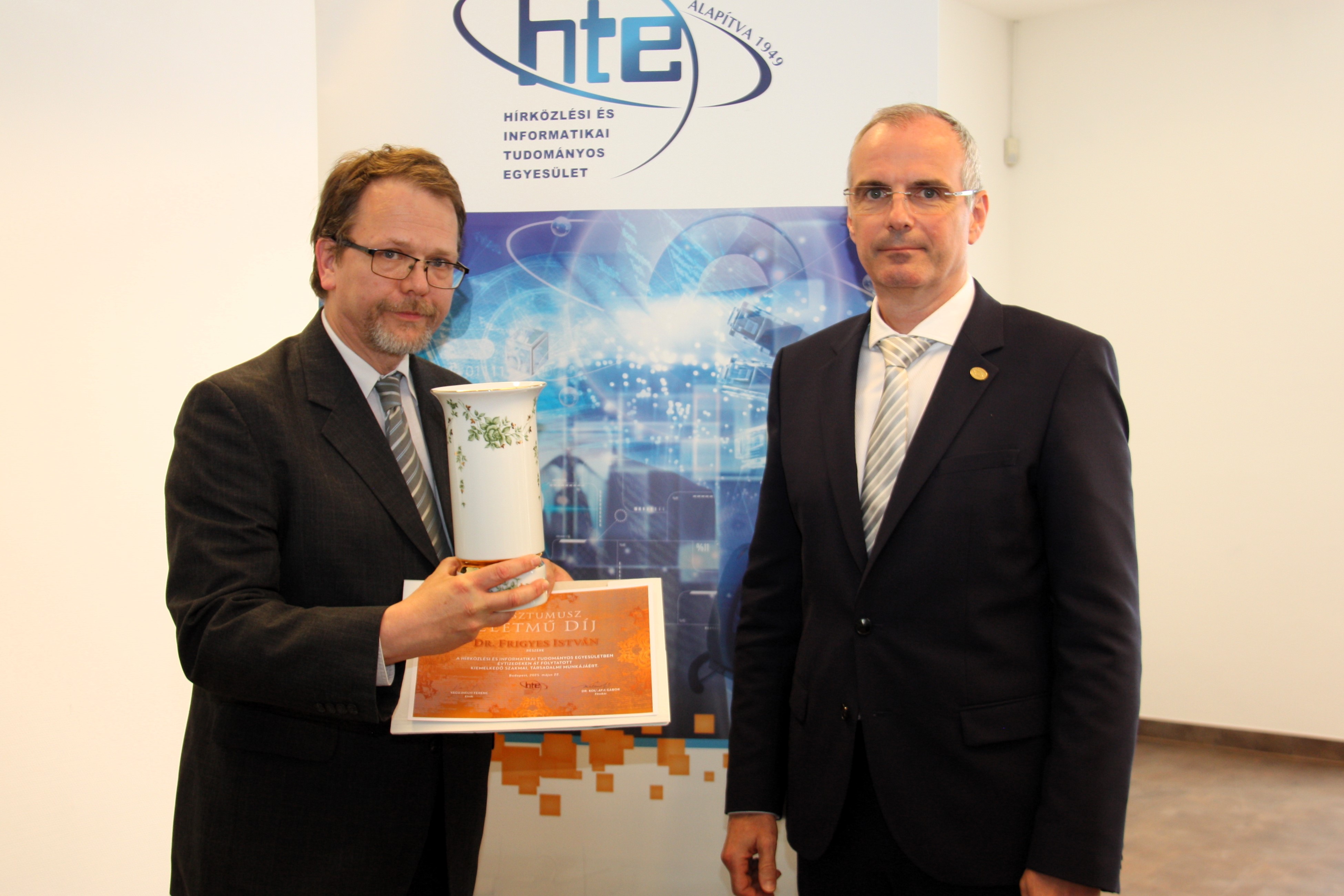 | Turányi Gábor | Az Egyesület a HTE Életmű díjjal Turányi Gábor teljes életútját kívánja elismerni, szakmai sikerein és jelentős társadalmi tevékenységén, egyesületi munkáján kívül külön értékelve azt az őszinte, egyenes hozzáállást a szakmai kérdésekhez, melyek hozzásegítették a hazai hírközlést az elmúlt évtizedekben elért fejlődéshez. | ![]() Varsányi János és Turányi Gábor |
