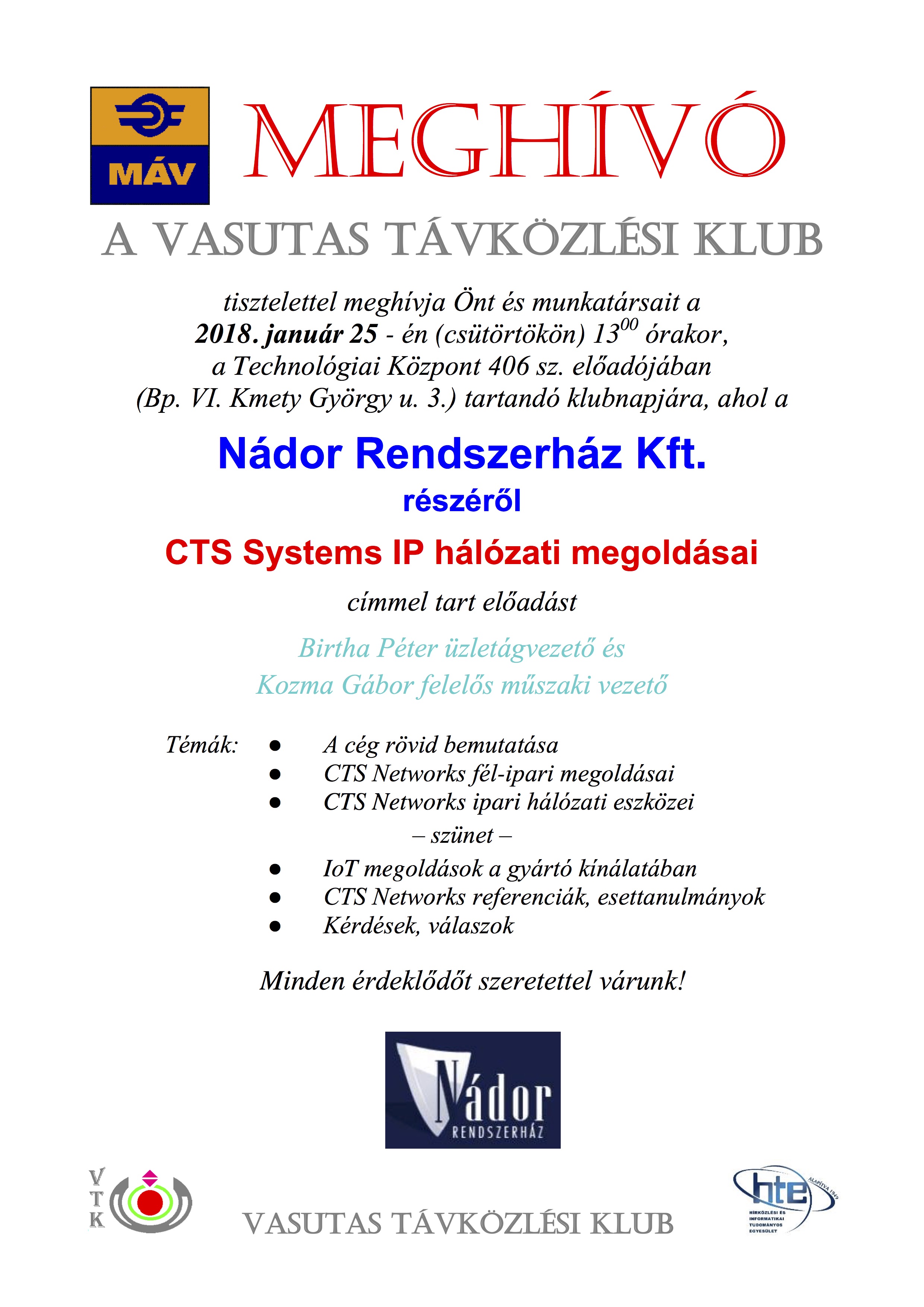 A VASUTAS TÁVKÖZLÉSI KLUB tisztelettel meghívja Önt és munkatársait a következő klubnapjára, ahol a Nádor Rendszerház Kft. részéről